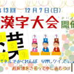 12月7日(日)に、2年ぶりの漢字大会を行います。今回で13回目を迎える大盛況のイベントです。それぞれの学年で競い合ったり、団体で力を合わせて漢字クイズに挑んだり、どの学年でも楽しめる大会になっています。日頃の頑張りを試す絶好のチャンスですので、景品、おかし獲得を目指してチャレンジしてください。塾に来ていないお友達、兄弟が一緒の場合参加費は無料です。みんなで一緒に楽しみましょう。ご不明な点は敬倫メイツ 914-8733 安藤までご連絡ください。
